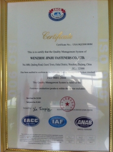 温州市金久紧固件有限公司设有六个车间,检测设备完整,产品质量保证、深得用户的信赖,并于2007年8月份通过ISO9001质量管理体系认证.本公司坚持以严格管理、优质的产品和良好的服务开拓市场服务客户.温州“金久”牌紧固件已在市场有较高的知名度.