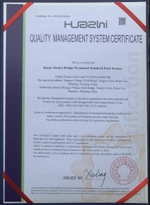 浙江省瑞安市场桥永久标准件厂专业从事“巨泰”牌弹簧垫圈开发、制造及销售于一体的企业,年生产能力已突破万吨。本厂成立于1984年,坐落坐在美丽的海滨城市瑞安市上叶工业区。拥有国际先进水平的高精密检测仪器和生产设备,高素质的技术骨干和管理团队。